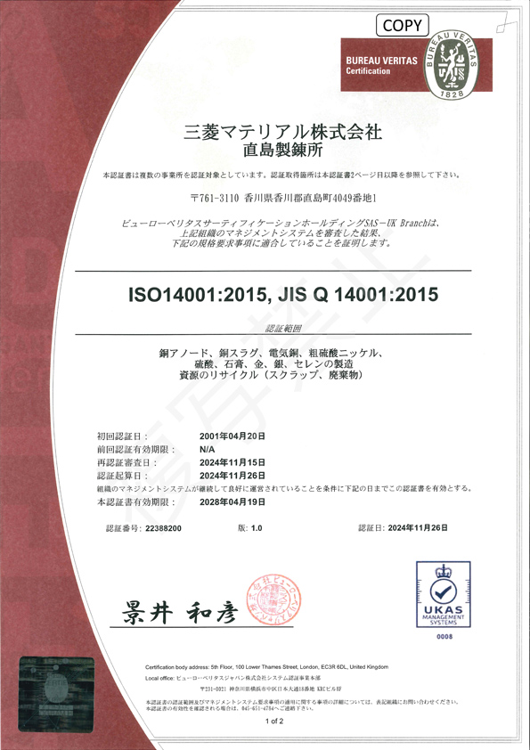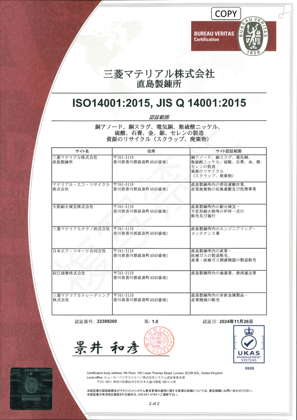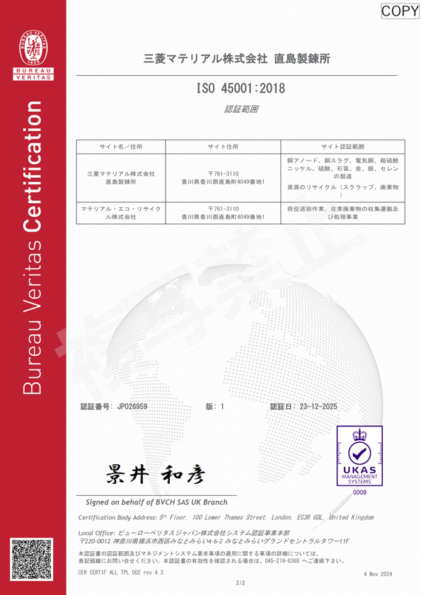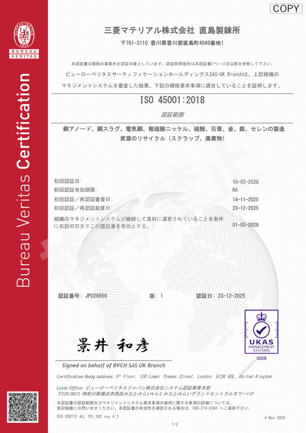 ※直島製錬所はISO45001、ISO14001、ISO9001の認証を取得しています。