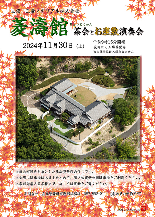 本年11月30日(土)に、地域貢献活動の一環として、日ごろ非公開の直島製錬所迎賓館である「菱濤館」を一日限定で開放し、同館茶室を利用した茶席や、プロの演奏家によるお座敷演奏会を開催いたします。